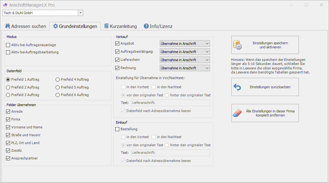 Sie können AnschriftManagerLX Pro völlig unverbindlich und kostenfrei für 30 Tage testen. Die Demo-Version ist im Funktionsumfang nicht eingeschränkt. Nach Ablauf der 30 Tage, werden die Anschriften für neue Aufträge nicht mehr übernommen. Bestehende Aufträge werden nicht geändert.