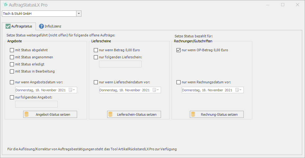AuftragStatusLX Pro ist ein Programm um den Auftragsstatus von Angeboten und Lieferscheinen zu bearbeiten. Angebote bei denen man den Auftrag nicht bekommen hat, bleiben in der Übersicht der offenen Angebote auf Dauer erhalten. Lieferscheine zu Garantielieferungen, Mustersendungen etc. die nie zu einer Rechnung weitergeführt werden, bleiben immer als offener Lieferschein bestehen. Mit AuftragStatusLX Pro können Sie abgelehnte oder alte Angebote "erledigen" und Lieferscheine, die erledigt sind auch als solche markieren.
