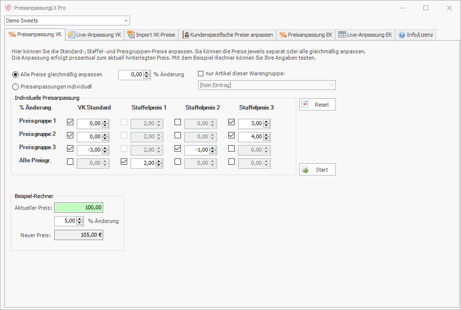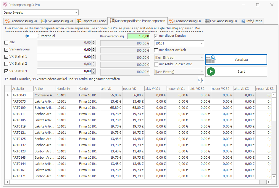 Sie können PreisanpassungLX Pro völlig unverbindlich und kostenfrei für 30 Tage testen. Die Demo-Version kann die Preisanpassung NICHT durchführen. Bei den Standardpreisen wird Ihnen das Programm anzeigen, wie viele Artikel betroffen sind und bei den kundenspezifischen Preisen erhalten Sie eine komplette Vorschau über die Änderungen.