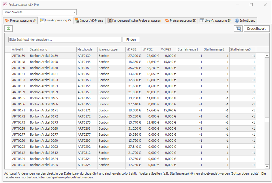 Es gibt eine Live-Bearbeitung von Preisen direkt in der Artikeltabelle, sowohl für Einkaufs- wie auch Verkaufspreis. Damit sind manuelle Änderung in einem Bruchteil der Zeit erledigt.