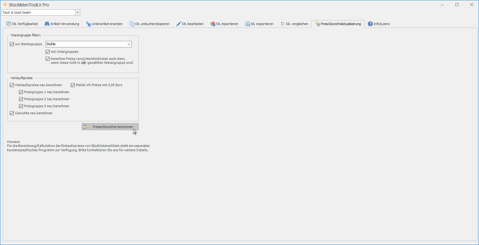 - Preisaktualisierung: Berechnet VK-Preise (VK 1 bis 3, auch einzeln) von Stücklistenartikeln auf Grund der VK-Preise (1-3) der dazugehörigen Artikel neu. Die Neuberechnung kann auf einzelne Warengruppen eingeschränkt werden.