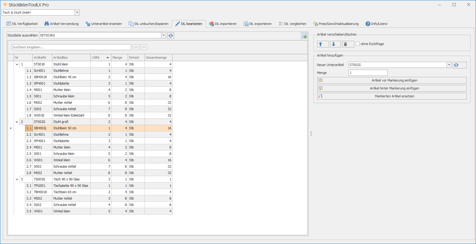 - Strukturstücklisten und einfache Stücklisten bearbeiten (Artikel verschieben, löschen, hinzufügen) inkl. Suche in der Stückliste